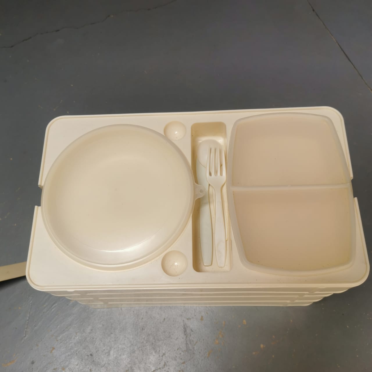 4 tier vintage picnic stacker, each tray with lids, stacked on top of each other, to carry as one unit